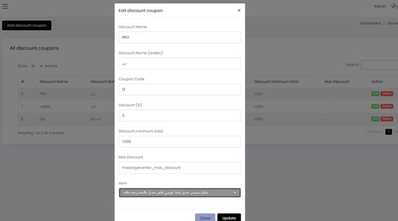 Fill in the following fields: - Discount Name: Enter the name in English (e.g., PRO). - Discount Name (Arabic): Enter the Arabic label. - Coupon Code: The code customers must enter (e.g., 12). - Discount (%): Enter the percentage to apply (e.g., 3%). - Discount Minimum Total: The minimum bill amount required to activate this discount (e.g., 1.000 KD). - Max Discount: (Optional) The highest possible discount value (can be left blank if not limited).