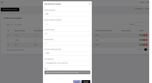 This guide explains how to create and manage discount coupons in the restaurant POS system. You will learn how to define coupon details in English and Arabic, set the discount percentage, define usage limits, and exclude specific items from receiving the discount.