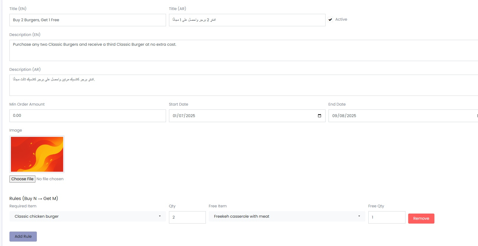 - Title (AR): Enter the Arabic equivalent. Example: اشترِ 2 برجر واحصل على 1 مجانًا