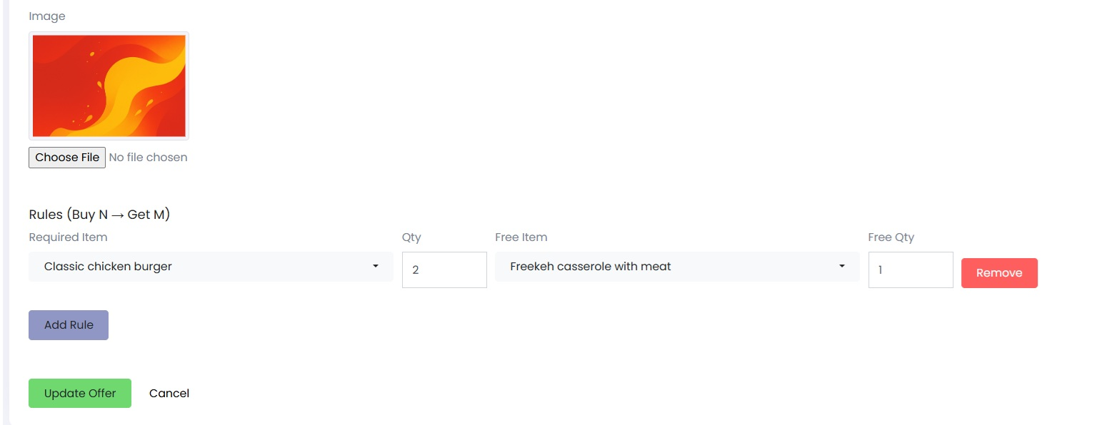 - Free Item: Select the free item to give (e.g., Freekeh casserole with meat).